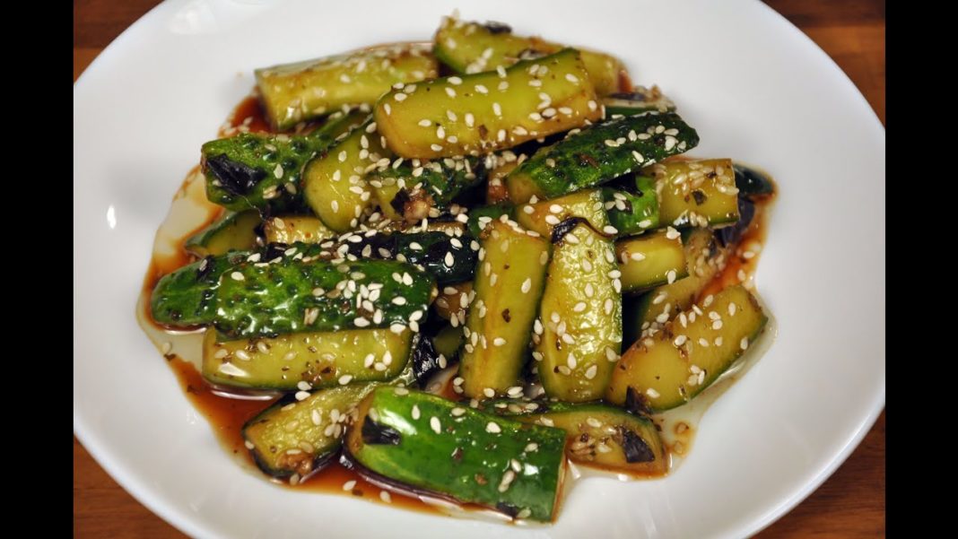 Огірки порізати брусочками, посипати сіллю і залишити на 15 хвилин, щоб пустили сік. Сік злити. До огірків додати подрібнений на дрібній тертці або через часникодавку часник, червоний гострий перець, соєвий соус, оцет. Перемішати. У сковороді розжарити рослинне масло і всипати кунжут на 10 секунд. Відразу ж додати до огірків і перемішати. Накрити кришкою або харчовою плівкою і дати настоятися 30 хвилин.